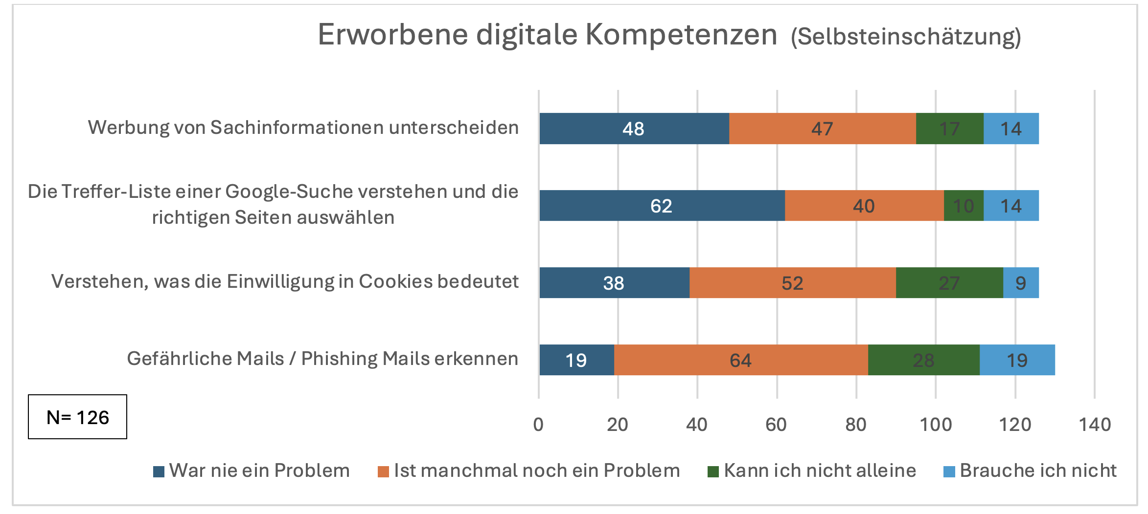 Dafür gibt es nicht nur in dieser Evaluation keinen Nachweis, sondern auch sonst nicht. Vielmehr gibt es viele Befunde, die Erfahrungssorten keine maßgebliche sondern eher eine marginale Rolle beim Erwerb digitaler Kompetenzen und digitaler Teilhabe zuweisen. Zuletzt in der BITKOM-Studie haben 54% der Befragten angegeben, dass sie sich ihre digitalen Kompetenzen aneignen, indem sie Freunde, Familie oder Bekannte fragen, aber nur 5%, indem sie Sprechstunden oder Beratungsangebote nutzen. Ein ähnliches Bild zeigen viele vergleichbare Umfragen.