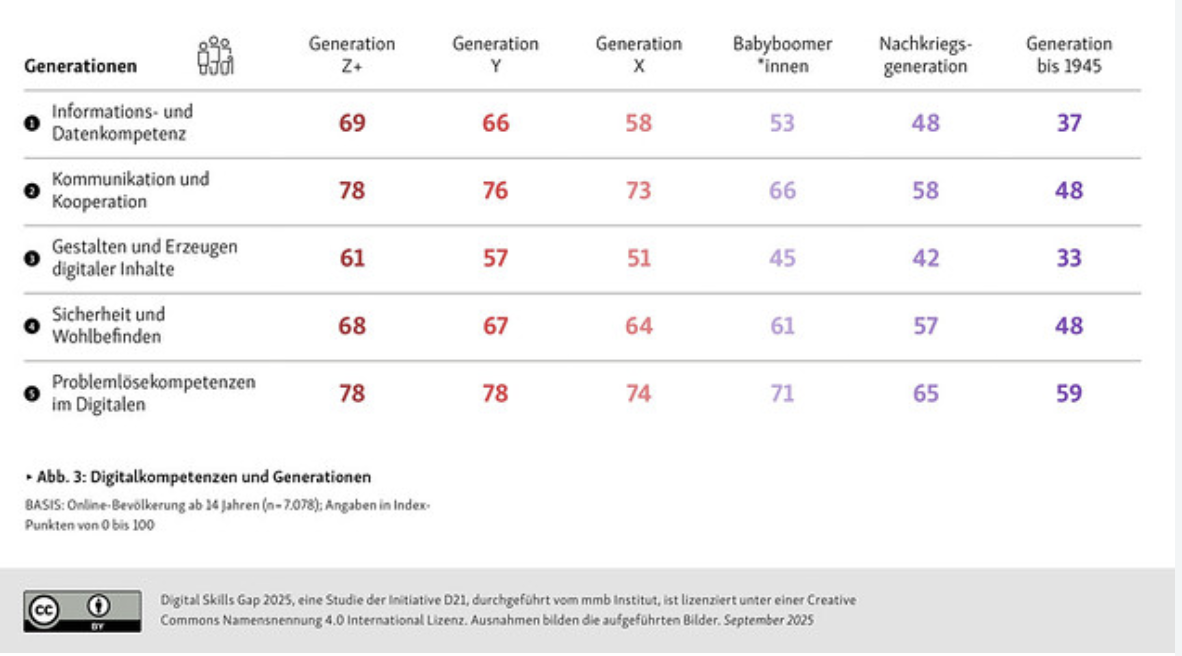 In der eingangs erwähnten Forderung weist die Initiative D21 auf die bereits seit 2023 laufende Digitale Kompetenzoffensive in Österreich hin. Die Strategie "Digitale Kompetenzen Österreich" ist ein von 500 Expertinnen und Experten entwickeltes und von mehreren Bundesministerien getragenes Programm, mit dem digitale Kompetenzen in der Bevölkerung für die alltägliche Nutzung und die Qualifizierung von IT-Fachkräften mit insgesamt 350 Maßnahmen gefördert werden. Nach einer aktuellen Zwischenbilanz vom September 2025 ist man auf einem guten Weg. Mit dem Programm "Digital Überall" wurden 4.500 Workshops mit 43.000 Teilnehmenden durchgeführt. Über ein Drittel der österreichischen Gemeinden bietet Workshops an und jede vierte Gemeinde setzt auf "Digi-Dolmetscherinnen und Digi-Dolmetscher, die u.a. die Umsetzung der "Digital Überall"-Workshops in und für die eigene Gemeinde vor Ort ermöglichen."