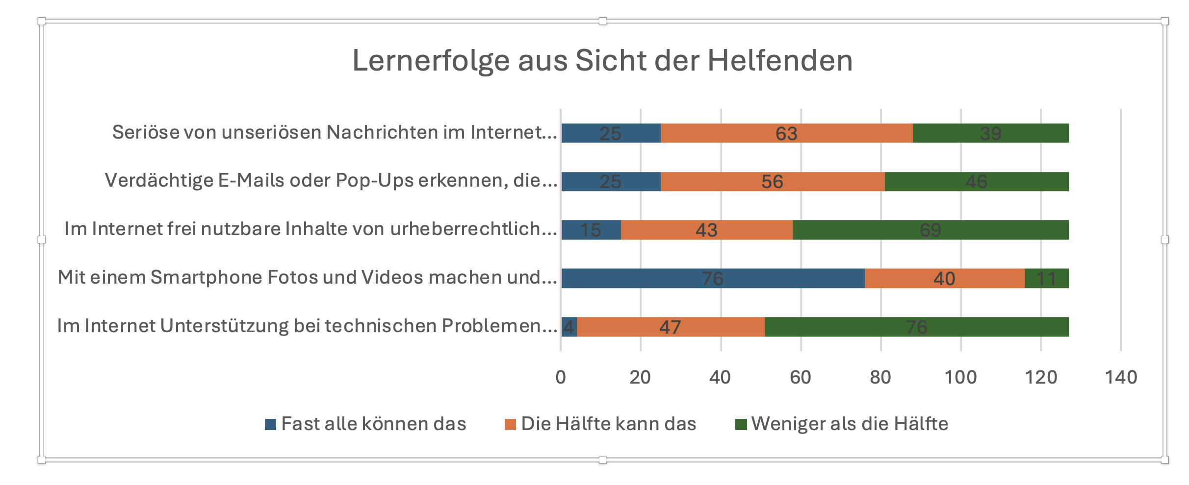 Leider fehlt auch jeder Versuch, den mit diesen Angeboten erzielten Lernerfolg zu ermitteln. In der ersten Evaluation wurden dazu auch die Teilnehmenden an diesen Angeboten befragt. Das ist aufwendig und auch nicht repräsentativ. Aber was relativ einfach möglich gewesen wäre, ist die Einschätzung der Helfenden bzw. Ehrenamtlichen zu den Lernerfolgen zu erfragen. In der ersten Evaluation wurden diese nach ihren konkreten Lernzielen gefragt und um eine Schätzung gebeten, welcher Anteil der Teilnehmenden diese Ziele erreicht hat. Danach sagen 30%, dass weniger als die Hälfte der Teilnehmenden gelernt hat, seriöse von unseriösen Nachrichten zu unterscheiden und 36% haben gesagt, dass weniger als die Hälfte verdächtige Mails oder PopUps erkennen kann. Solche Antworten werfen Fragen auf, denen sich weder das Autorenteam noch der Auftraggeber stellen wollte.