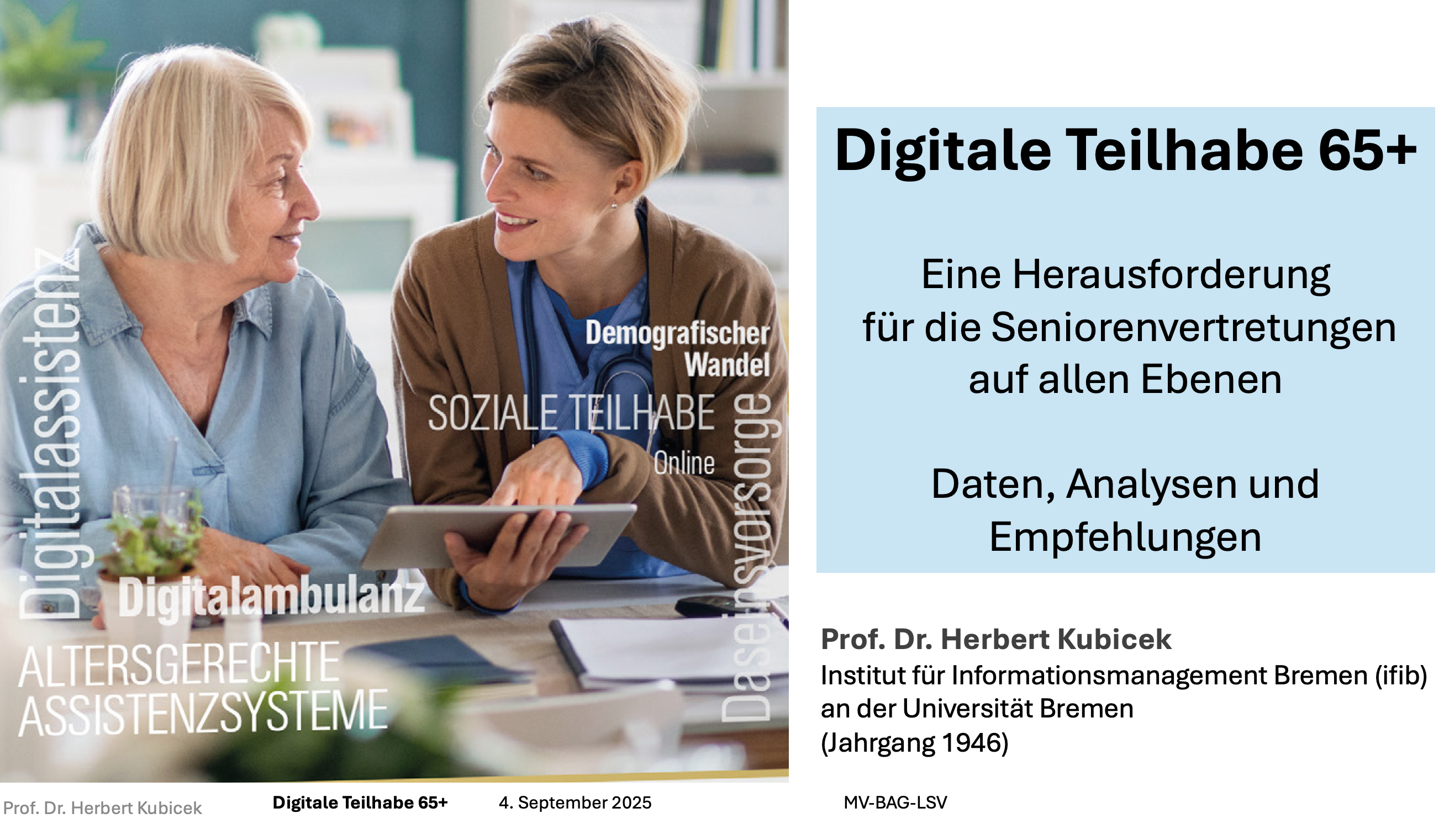 In der vergangenen Woche habe ich einen Vortrag auf der Mitgliederversammlung der Bundesarbeitsgemeinschaft der Landesseniorenvertretungen (BAG LSV) in Weimar zum Thema "Digitale Teilhabe im Alter als Herausforderung für die Seniorenvertretungen" gehalten. Mit großen Hoffnungen bin ich von Bremen nach Weimar gefahren, weil ich in den Seniorenvertretungen die politischen Akteure sehe, die am ehesten die Politik bewegen könnten, endlich ihre Versprechungen zur Digitalen Teilhabe einzulösen. Doch das scheint nicht so einfach zu sein, wie gleich zwei enttäuschende Erkenntnisse zeigen.