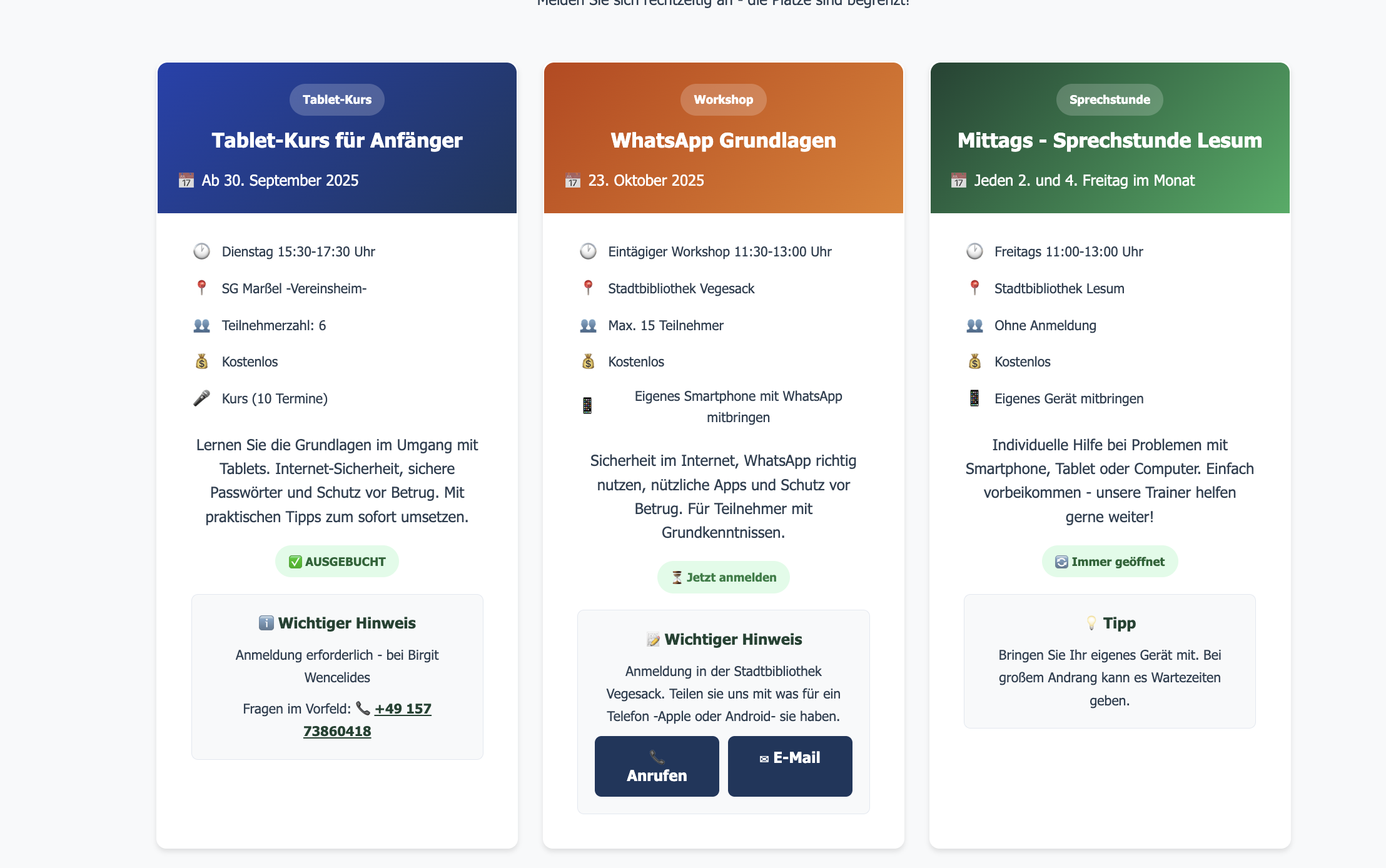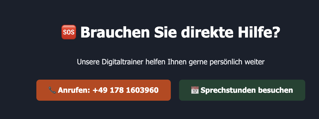 Zunächst zum Angebot selbst. Vorbildlich finde ich, dass es neben räumlich verteilten und gut erreichbaren Schulungen und Sprechstunden auch ein telefonisches Support-Angebot gibt: